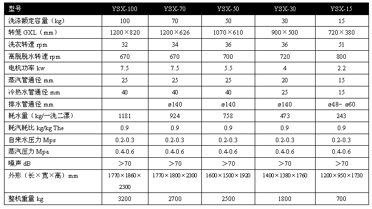 洗滌室、洗滌脫水桶臥式安裝、熱噴鋅外缸、防腐蝕; 內膽采用質不銹鋼材料焊接而成。關鍵零部件采用進口或國內質;如:變頻器采用LG,主軸承采用美國鐵姆肯。