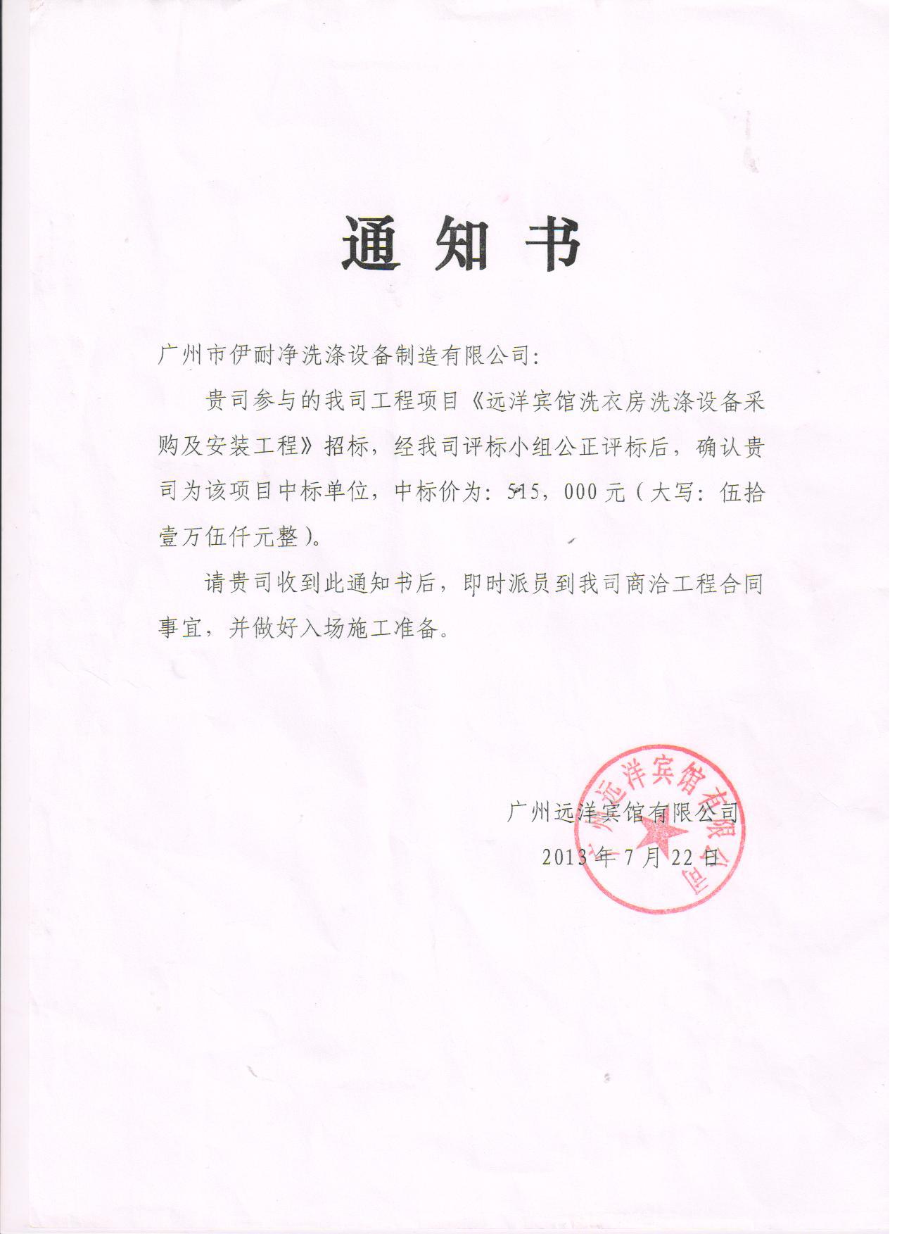 廣州遠(yuǎn)洋賓館洗衣房設(shè)備項(xiàng)目中,廣州伊耐凈洗滌設(shè)備制造有限公司,技?jí)喝盒郏摲f而出,以515000元價(jià),成功中標(biāo)。